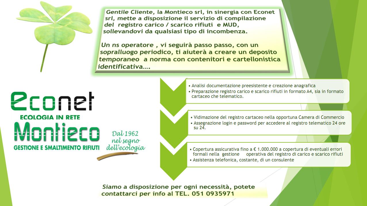 Per la gestione rifiuti, raccolta rifiuti, stoccaggio rifiuti, smaltimento rifiuti, trasporto di rifiuti pericolosi e non pericolosi, rifiuti speciali, rifiuti industriali così come per il recupero oli usati, ritiro oli usati, smaltimento oli, batterie, emulsioni, fanghi, Montieco fornisce numerosi servizi: consulenza, analisi chimiche dei rifiuti, pulizia cisterne e serbatoi, noleggio e vendita cisterne e contenitori per lo stoccaggio rifiuti, tenuta dei registri di carico e scarico rifiuti.